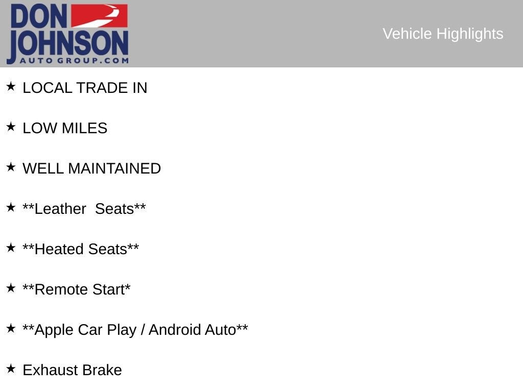 Recent Arrival! LOCAL TRADE IN, LOW MILES, WELL MAINTAINED, **Leather Seats**, **Heated Seats**, **Remote Start*, **Apple Car Play / Android Auto**, 15 Diagonal Multicolor Head-Up Display, 220 Amp Alternator, Exhaust Brake, High Idle Switch.